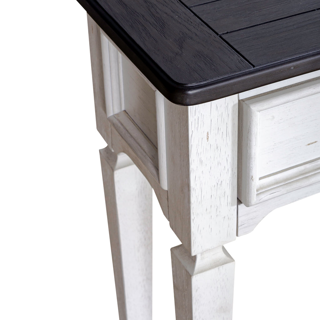 Elevate your space with the Allyson Park 72-inch hall console table. Crafted of pine solids with white oak veneers, this piece features a wirebrushed white finish with a charcoal top, three full extension drawers and a bottom shelf for additional storage. This timeless console table will make a wonderful addition to your cottage or farmhouse styled home.