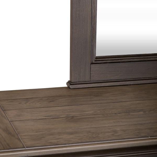 Design possibilities are endless with the Allyson Park dresser and mirror. Crafted of pine solids with cathedral white oak tops, this piece features a wire-brushed black forest finish with brown undertones and ember gray tops with planked accents. The dresser has eight wood framed full extension drawers of varying sizes, all of which offer plenty of deep storage. The top drawers have felt lining. The bead molding, square tapered feet, and antique pewter drop bail and knob hardware offer a classic look with a casual feel. Attach the crown mirror with a beveled edge with the included bolt-on supports. Allyson Park offers cottage styles you love in a wire brushed two tone finish that will work from the beach to the mountains to an industrial loft.
