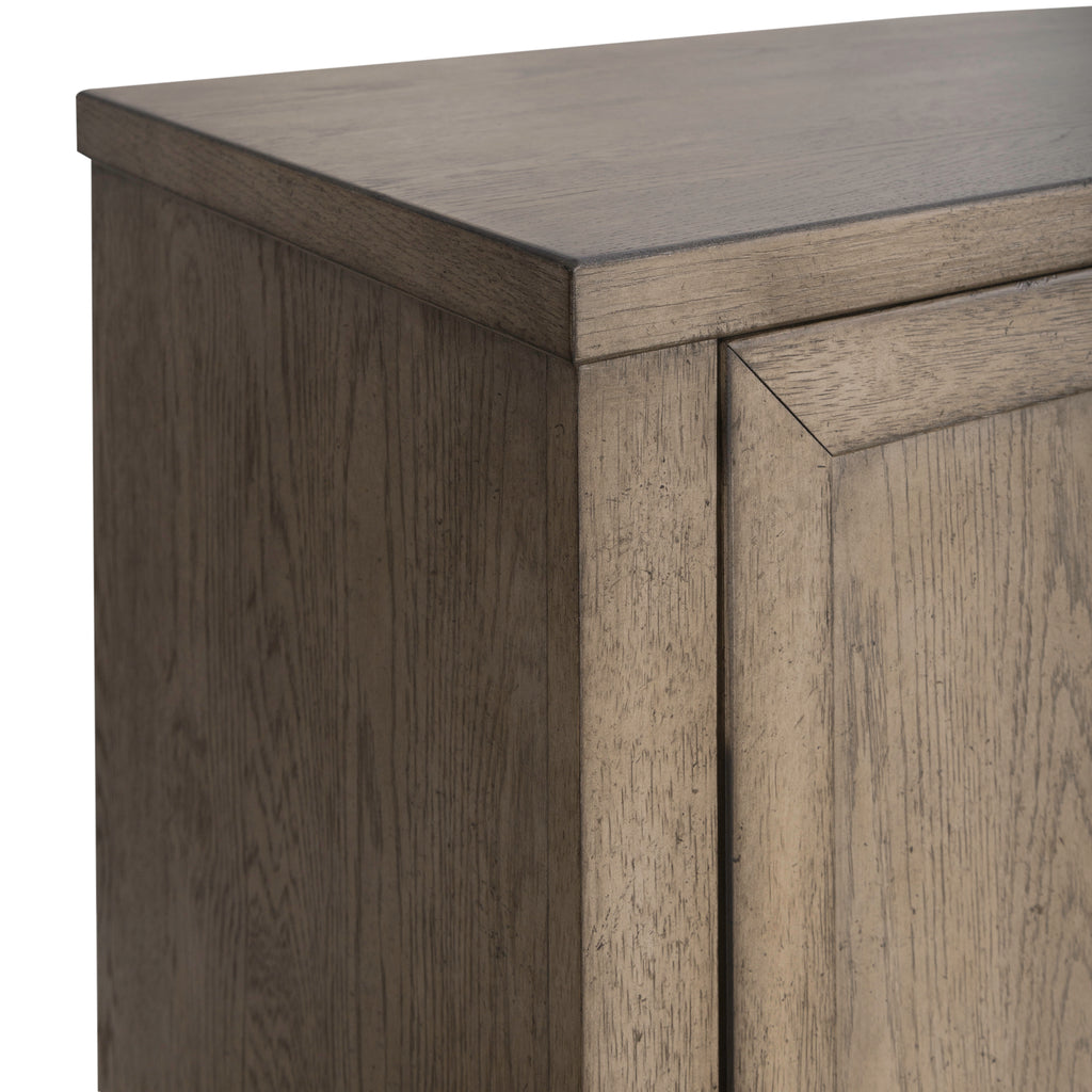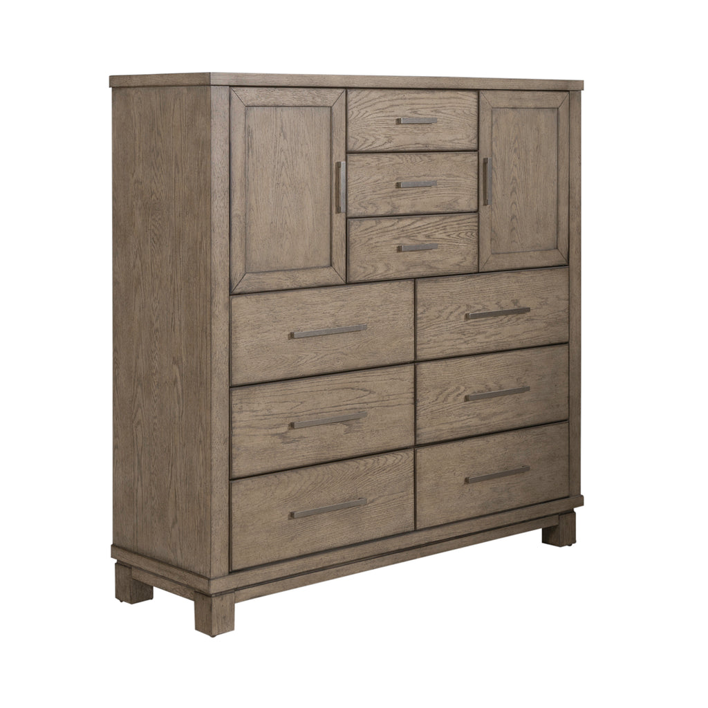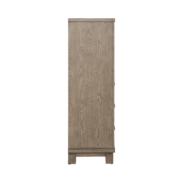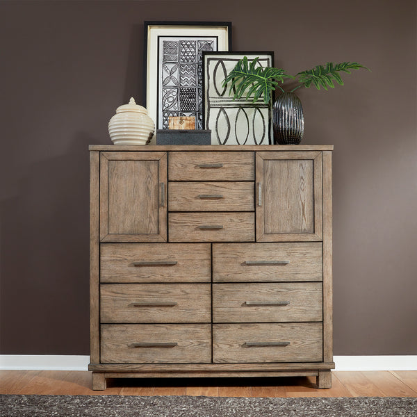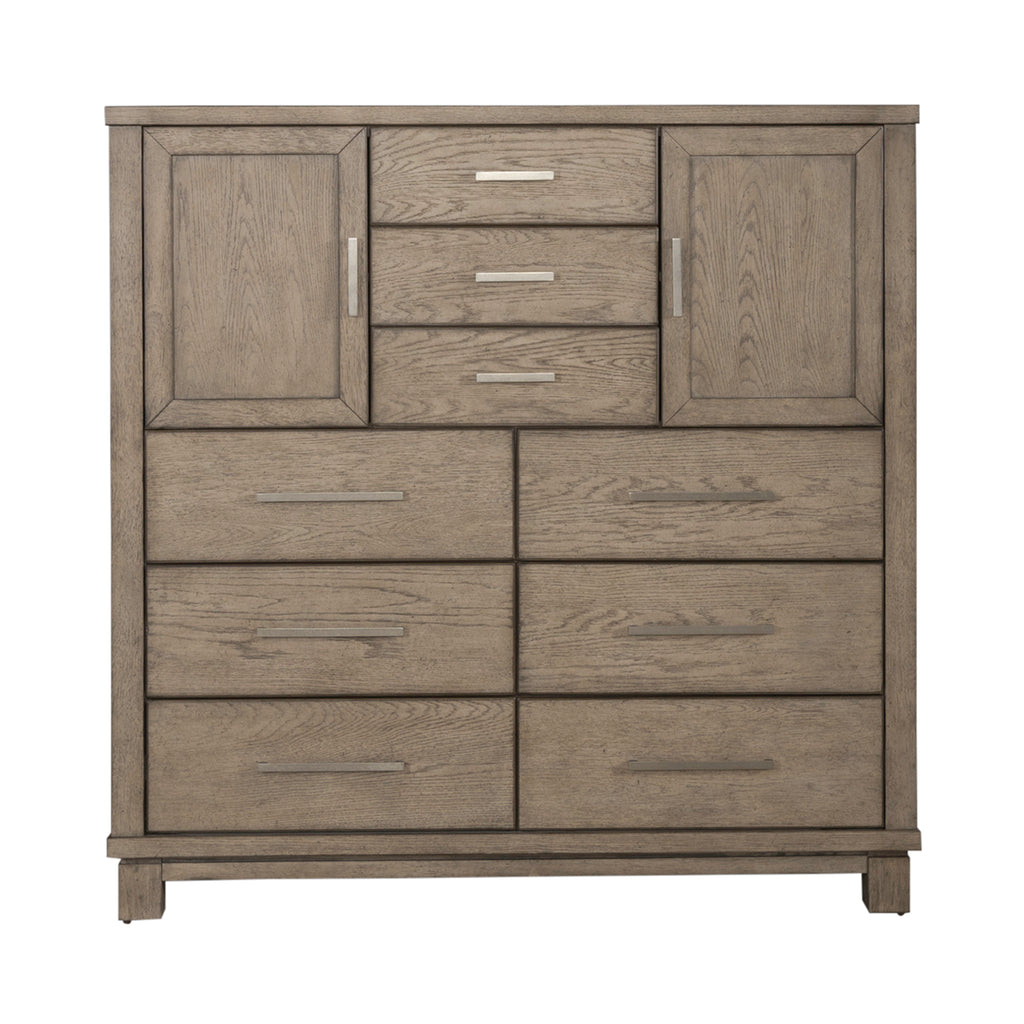 Casual contemporary living is bringing a new level of casual sophistication with the Canyon Road chesser. Crafted of rubberwood solids with reverse split heart white oak veneers, this piece features a burnished beige finish with brushed brass bar pull hardware. Storage abounds with this chesser and its nine full extension drawers and two doors. The drawers feature premium felt lined top and cedar lined bottom drawers. There is an adjustable shelf behind each door. The straight-lined contemporary styling flows nicely into a block foot. Express your personality without sacrificing style with this casual contemporary Canyon Road chesser.