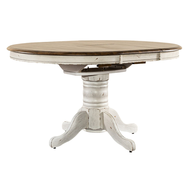 Reinvent your style with the Carolina Crossing five-piece pedestal table set. Crafted of rubberwood solids, this set features a heavily distressed antique white finish with an antique honey top and consists of a pedestal table and four Windsor back side chairs. The pedestal table has a 15” butterfly leaf allowing the user to expand the round top into an oval top and is anchored by a turned pedestal base flowing into splayed feet. The chairs feature saddle shaped seating for added comfort and turned splayed legs with nylon chair glides to protect your flooring. Carolina Crossing offers affordable solids in a perfect scale for smaller dining areas.