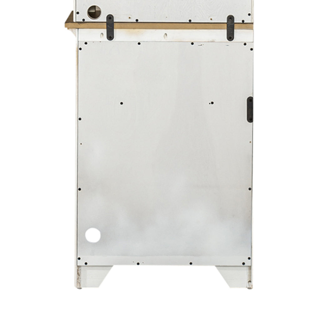 Maximize storage and convenience with the Farmhouse Reimagined right pier base. Crafted with pine solids with hickory and pine veneers, this piece features an antique white finish with chestnut tops, a fully stained interior drawer, and heavy crown molding accented by antiqued brass knob hardware. A fixed shelf is located beneath the drawer and is accented by the contrasting planked back panel, finished in chestnut. Pair this piece with the right pier top, left pier unit, entertainment hutch, and 72" tv stand to complete the set, as this piece cannot stand alone.