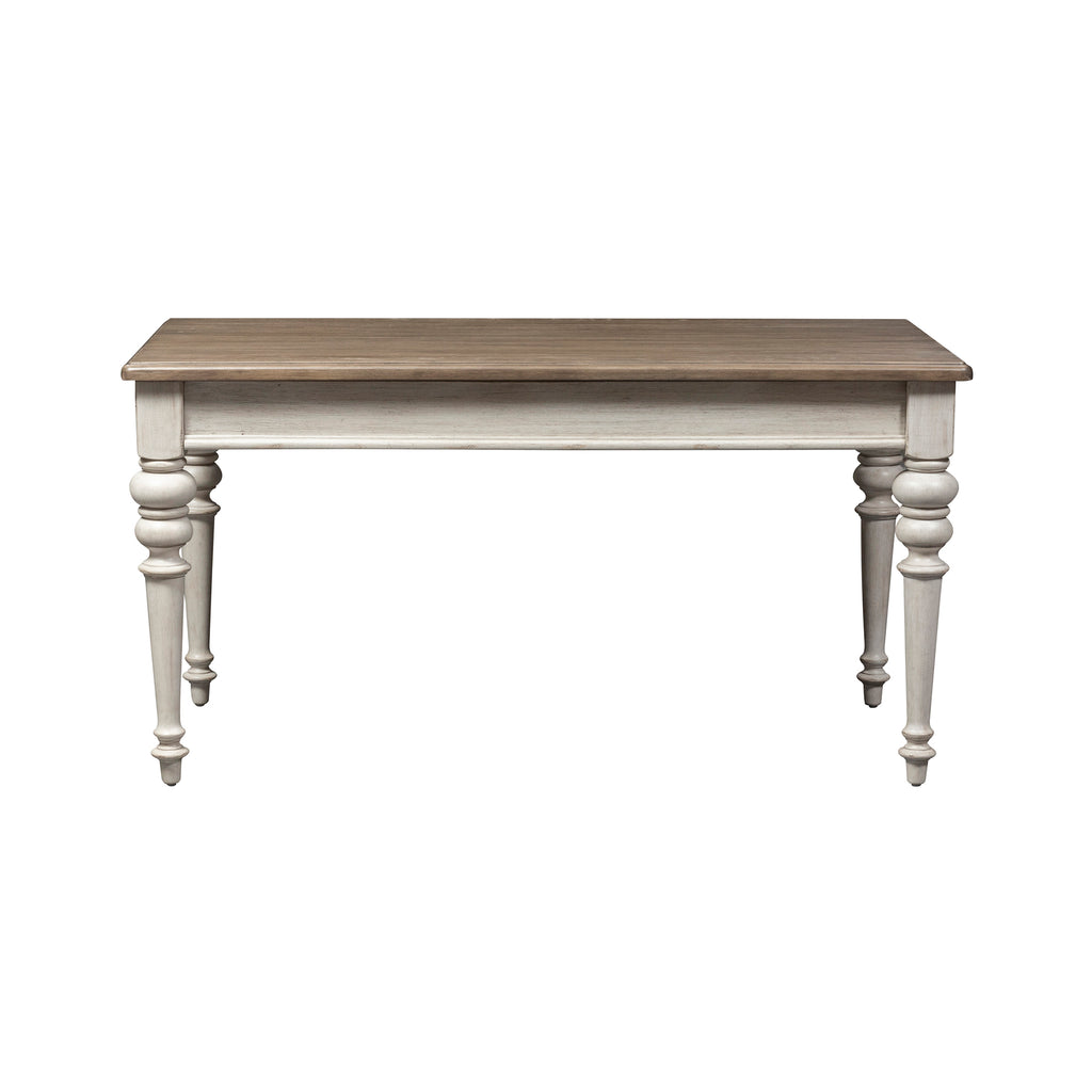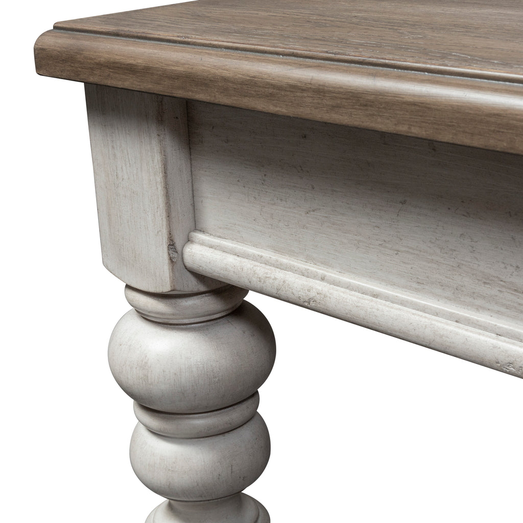 Work from home or in the office with the Heartland lift top writing desk. Crafted of rubberwood solids with oak and birch veneers, this piece features a heavily worn antique white finish with wire brush distressing and a tobacco wood toned top. This desk features one wood framed full extension drawer accented with an antique brass knob hardware, anchored by heavy turned legs. The manual lift mechanism allows for a stand or sit function for user convenience. Heartland is a beautiful collection in farmhouse styling with unique characteristics that give it an antique appeal.