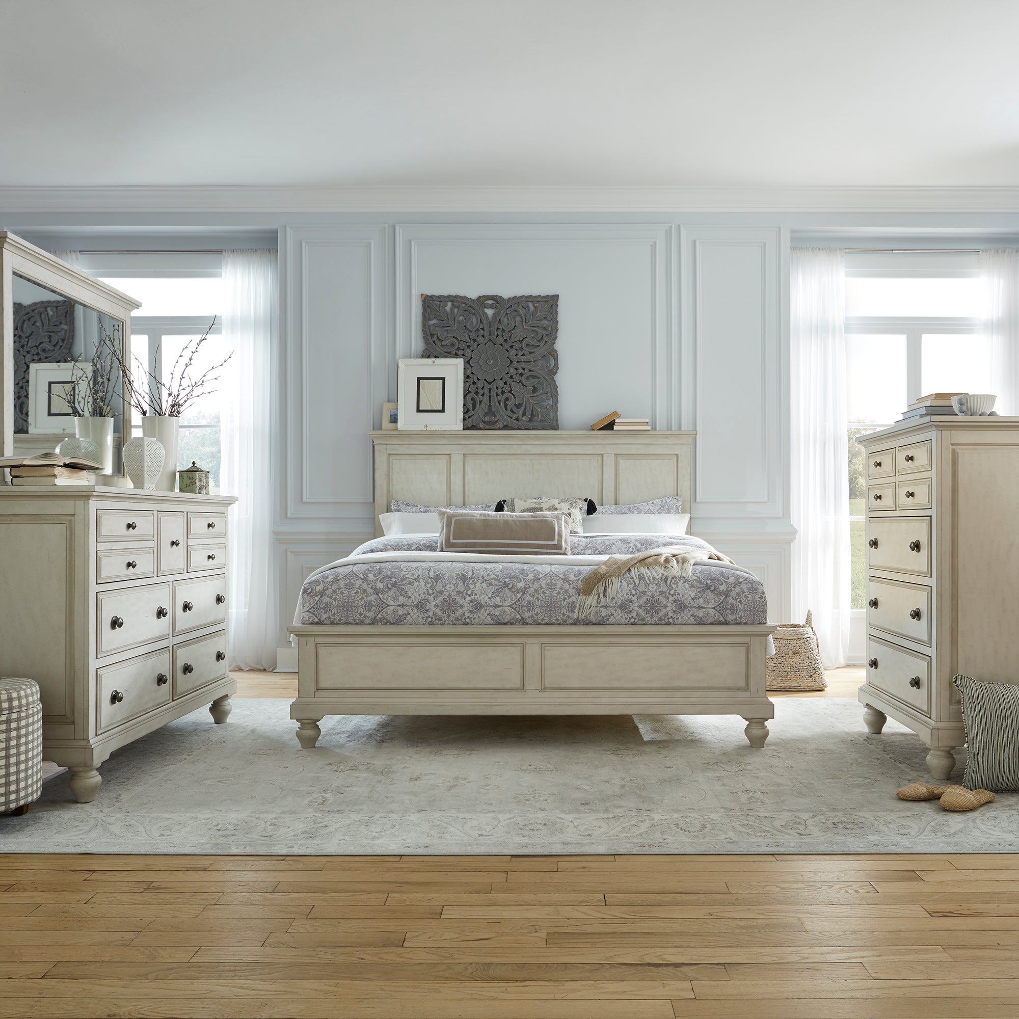 Live life beautifully with the High-Country king panel bed, dresser, mirror, and chest. Crafted of pine solids with knotty pine veneers, this kit features an antique white finish, a heavy step base rail molding adding lots of dimension, full extension drawers with felt lined top drawers, bead molding on the drawer fronts, turned bun feet, and is accented with large pewter knob hardware. The panel bed offers crown and bead molding. The dresser has seven drawers, including three across the top with the outer two having bluff-cut drawer fronts giving the illusion of smaller drawers while still offering deep storage. Pair the dresser with the landscape mirror which offers a beveled edge and bolt-on supports. The chest offers five drawers, including two smaller drawers at the top. Add this one-of-a-kind farmhouse bedroom collection to your charming home.