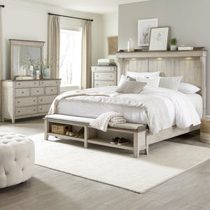 Create a relaxing retreat with the Ivy Hollow queen mantle storage bed, dresser, mirror, and chest. Crafted of poplar solids with pine and alder veneers, this kit features a heavily distressed weathered linen finish with saw marks and dusty taupe tops, full extension drawers with premium felt lined top and cedar lined bottom drawers, offset top drawers to create dimension, framed end panels, pin nail head accents, and antique pewter knob hardware. The mantle bed features a headboard with a shaped mantle crown and gallery top, with touch LED lighting illuminating planked panels. The upholstered storage bench footboard offers a great place to put your shoes and socks on with an upholstered seat in linen polyester fabric, a gallery top, and an open storage area. The dresser has nine drawers of varying sizes for plenty of storage. Attach the landscape mirror with the included bolt-on supports that features a beveled edge. The chest offers an additional five drawers of storage. Inviting and inspirational, Ivy Hollow offers the farmhouse look and design style that works for cottage or contemporary and is more about creating a look that we love.