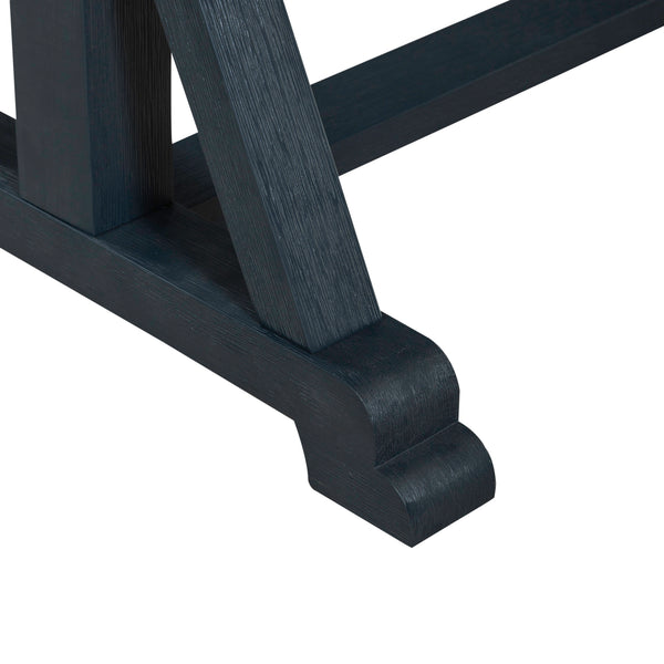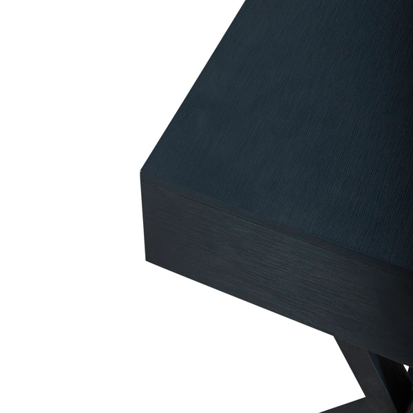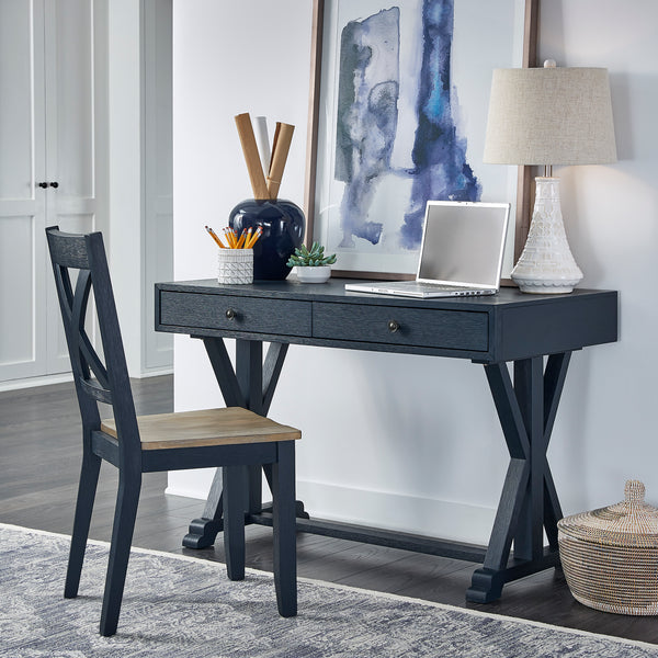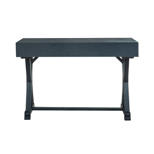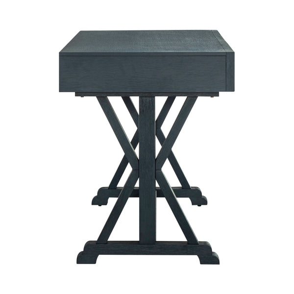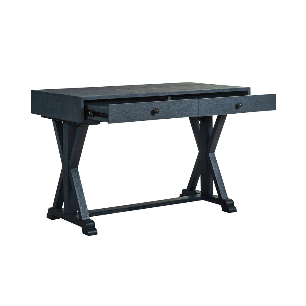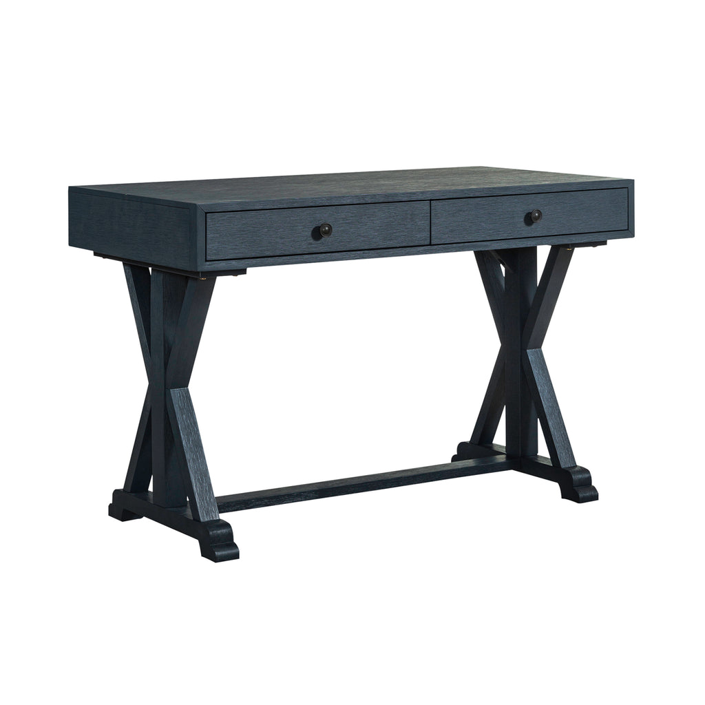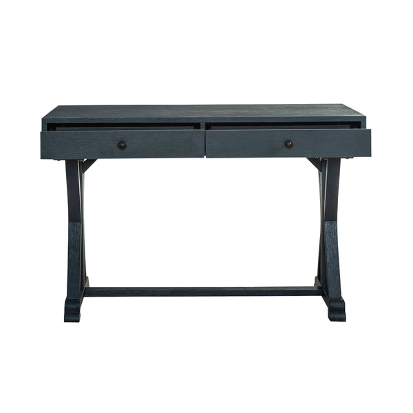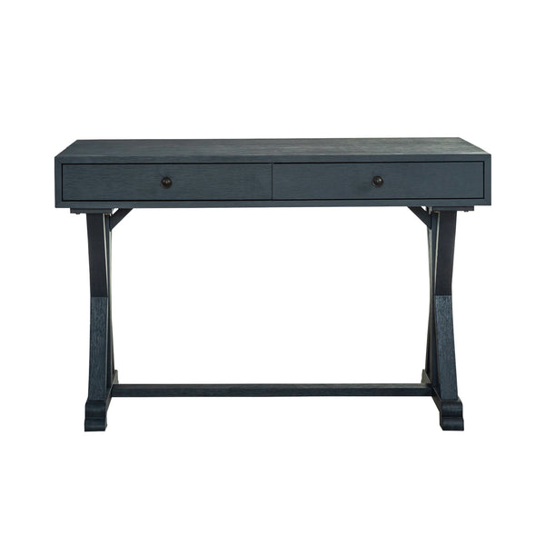 Feel at home while you work from home with the Lakeshore writing desk. Crafted with excellence using rubberwood solids and white oak veneers, this desk features a Wire-Brushed Navy finish. The desk has two full extension drawers accented with Dark Pewter knob hardware. The architectural style base features X-accent end panels. This desk is available in multiple finishes. Feel comfortable and elegant at the same time with the Lakeshore writing desk.
