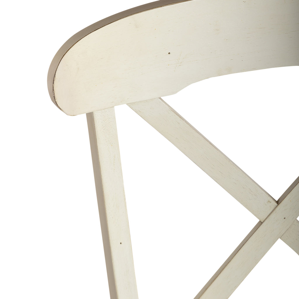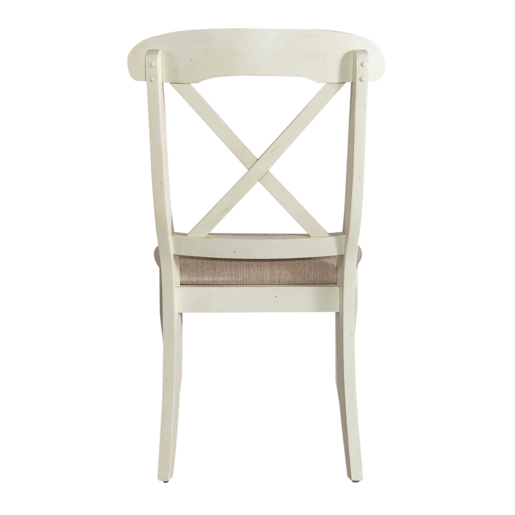 Sit in comfort and style with the Ocean Isle upholstered x back side chair. Crafted of rubberwood solids, this piece features a bisque finish, nylon chair glides to protect flooring, upholstery in a nubby linen, timeless napoleon styling, and is anchored by saber legs. This item comes in alternate finishes, sure to be a great addition to any home. Elegantly styled and casually proportioned, this chair works in a dining room or kitchen dining combination effortlessly.