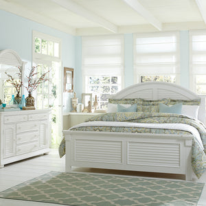 Live life beautifully with the Summer House I queen panel bed, dresser, and mirror. Crafted of poplar and pine solids this kit features an oyster white finish, bead molding, bun feet, full extension drawers with felt lined top drawers, and is accented with wooden knob hardware. The panel bed features louvered panels and arched crown molding. The dresser has two louvered panel doors and five drawers including two smaller flip down top drawers. Attach the arched louvered panel mirror with a beveled edge with the included bolt-on supports. With cottage design always in fashion, make the Summer House I a staple in your home.