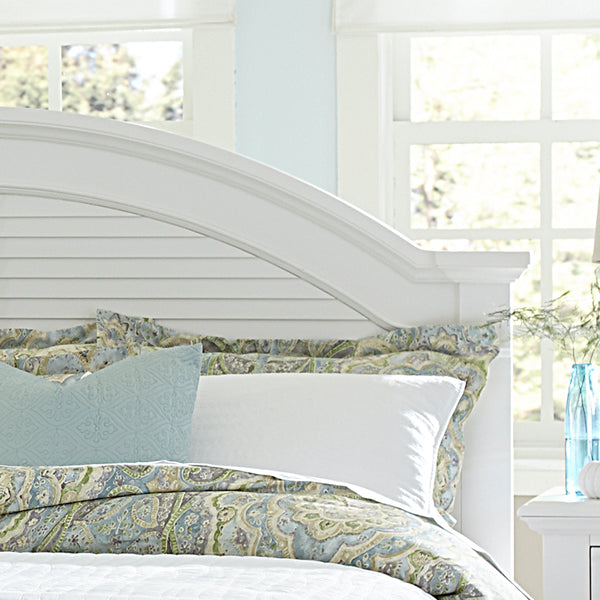 Enjoy the bright summer time feeling year round with the Summer House king panel headboard. Crafted with excellence using Poplar and Pine solids with wood products, this headboard is sure to turn heads with the arched cap rail and louvered panels highlighted with bead molding. This headboard can be purchased alone to be used with a Hollywood metal bed frame, or can be combined with the Summer House panel footboard and rails to complete the bed. The beautiful Oyster White finish will turn any dark, gloomy winter day into a bright, stress free summer morning.