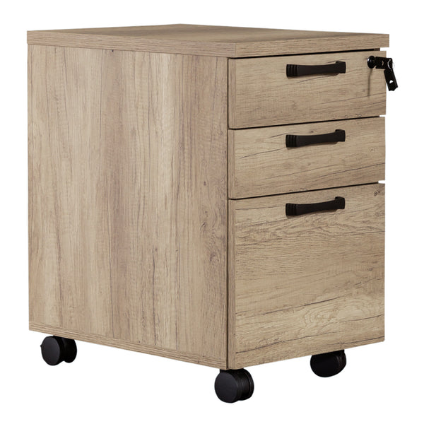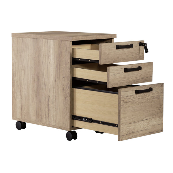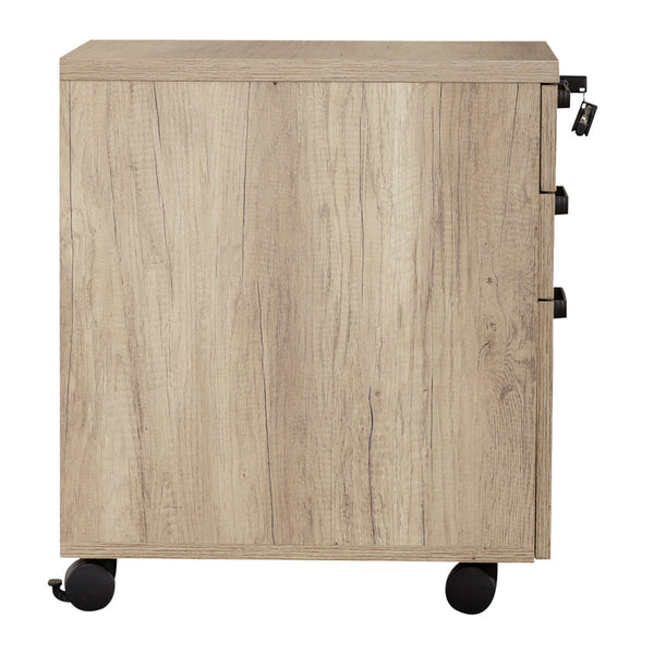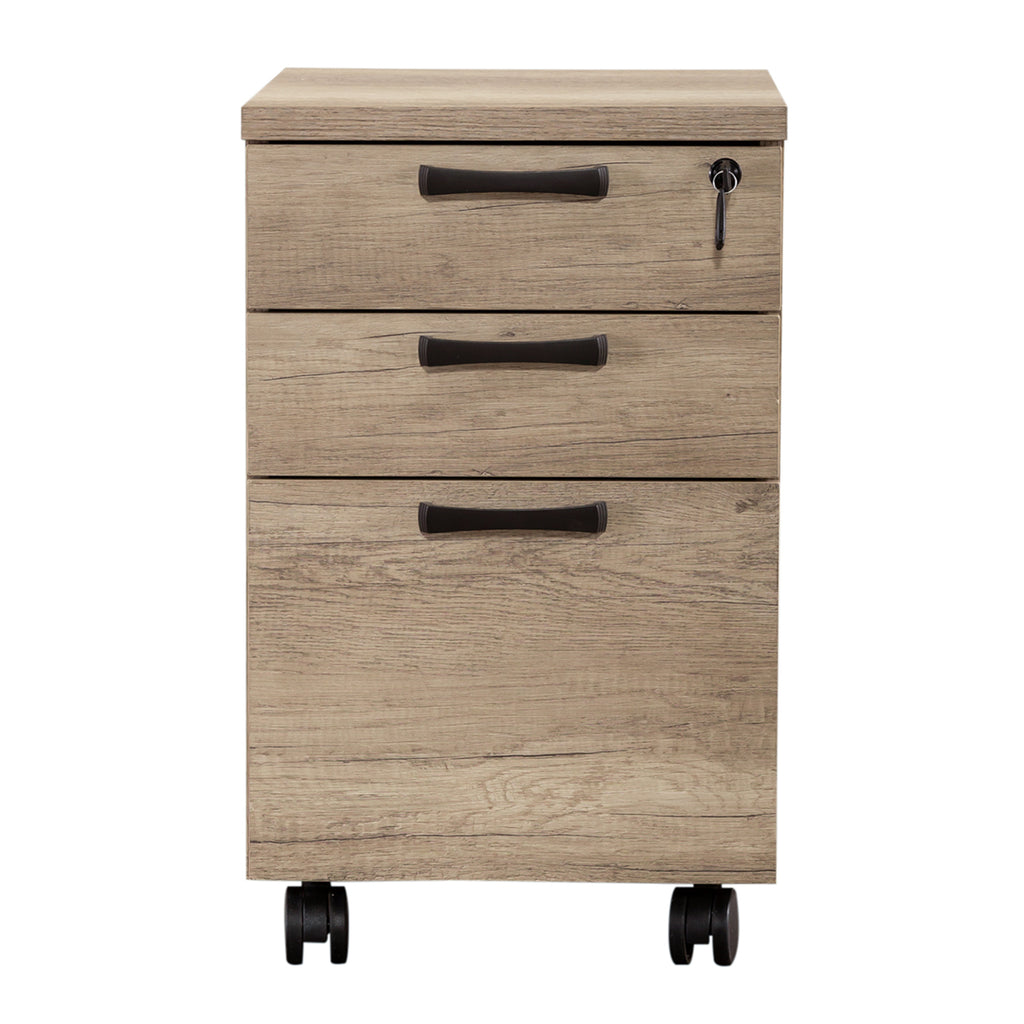 Enhance your office space with the Sun Valley file cabinet. Crafted of melamine and a rubberwood solid frame, this piece features a sandstone finish, full extension drawer glides for easy access to storage, casters for easy mobility, bottom lateral file drawer, and is accented by dark antique brass bar pull hardware. All three drawers can be locked by the lock on the top drawer, to protect confidential documents. Clean lines and small scale create the perfect balance for condos, lofts or second bedrooms. Sun Valley features solid wood picture framed cases with Melamine tops, fronts, and sides. The melamine provides a surface protection against scratches and wear and tear, ensuring this piece’s longevity in any home.
