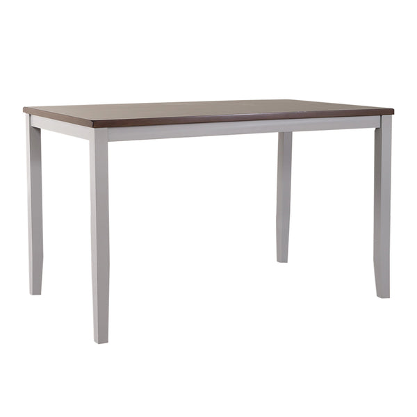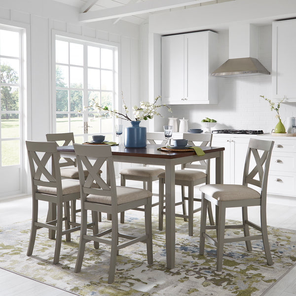 Sitting pretty with the Thornton seven-piece gathering table set. Crafted of rubberwood solids and MDF with mango veneers, this set features a two toned gray finish with a russet top and includes six x-back counterheight chairs and a gathering table. The table is large enough to seat six chairs, while still being great for small spaces. The counterheight chairs feature a padded upholstered seat in cream linen, tapered legs, and nylon chair glides to protect your flooring. This entire seven-piece set ships in one box. The Thornton seven-piece gathering table set works great for small spaces.